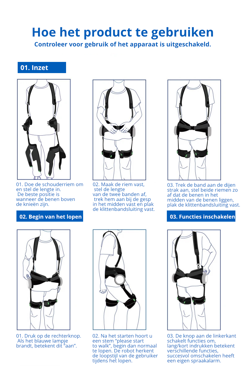 - Loopondersteuningsmodus: Het exoskelet past zijn kracht intuïtief aan voor een natuurlijke en vloeiende beweging tijdens het lopen.