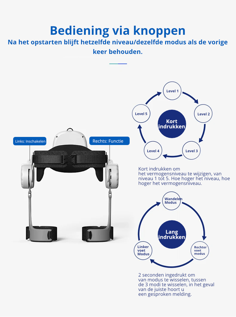 - Modus selecteren: Door de knop lang ingedrukt te houden, kunt u vloeiend schakelen tussen modi, waaronder de loopondersteuningsmodus, de linkervoetmodus en de rechtervoetmodus. Spraakinstructies geven duidelijke aanwijzingen en zorgen ervoor dat u altijd op de hoogte bent van de geselecteerde modus.