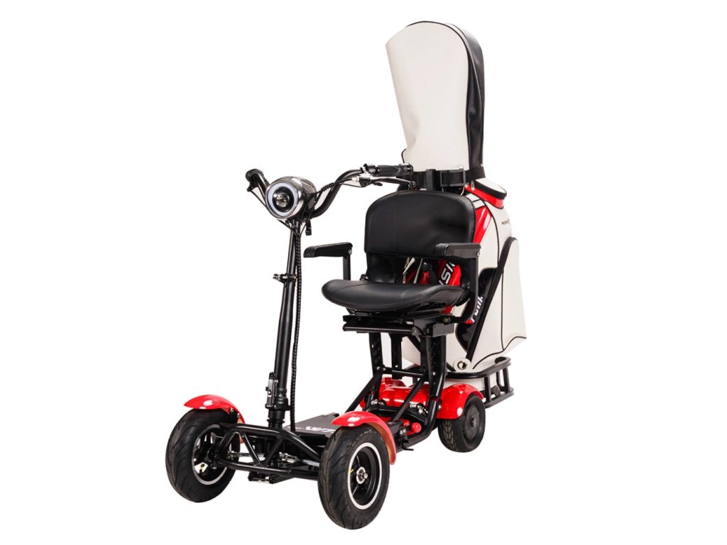 De lichte, compacte en krachtige elektrische scooter Eroute Fold 2 Golf, ontworpen voor golf, met lithiumbatterij past in de kofferbak van een auto, lift of appartement.